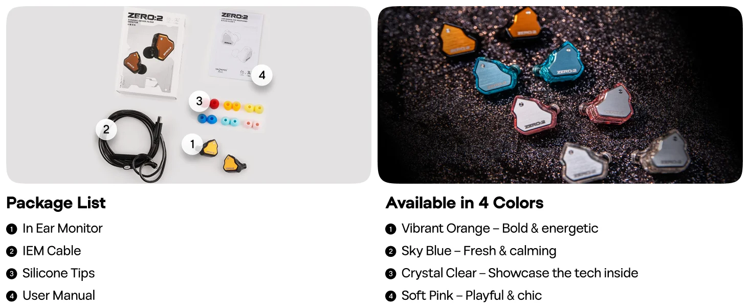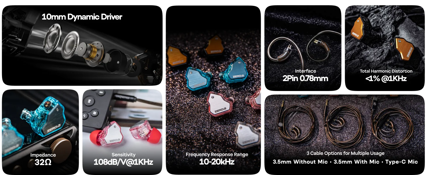 The improvements in the tonal characteristics of the Zero:2 were made possible thanks to a newly developed 10mm dual cavity dynamic driver. With an upgraded PU+Metal composite diaphragm, the driver is significantly more responsive, allowing faster diaphragm movement. This allows for harder hitting bass, while maintaining crispness and precision with each note. With a frequency range of 10Hz to 20kHz, the improvements in the new driver is immediately noticeable.