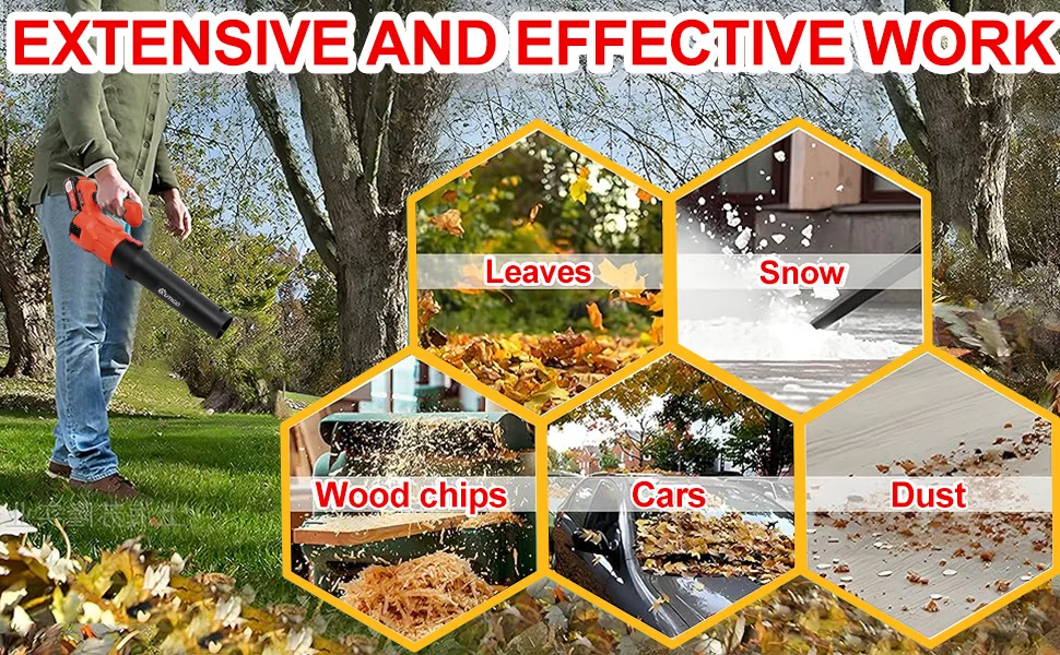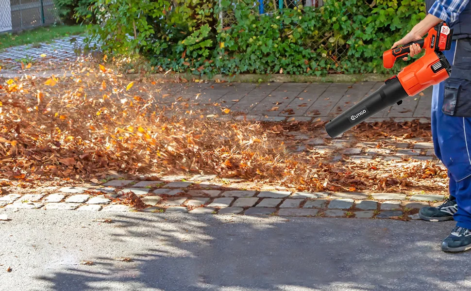 OUTIGO leaf blower has versatile and wide uses, with a blowing speed and air volume of 0-9 cubic meters per minute. It is perfect for both the garage and the home yard. You can sweep fallen leaves on the sidewalk, sweep snow, pine needles, wet leaves; sweep house debris, pet hair; sweep dust in hard-to-clean corners.